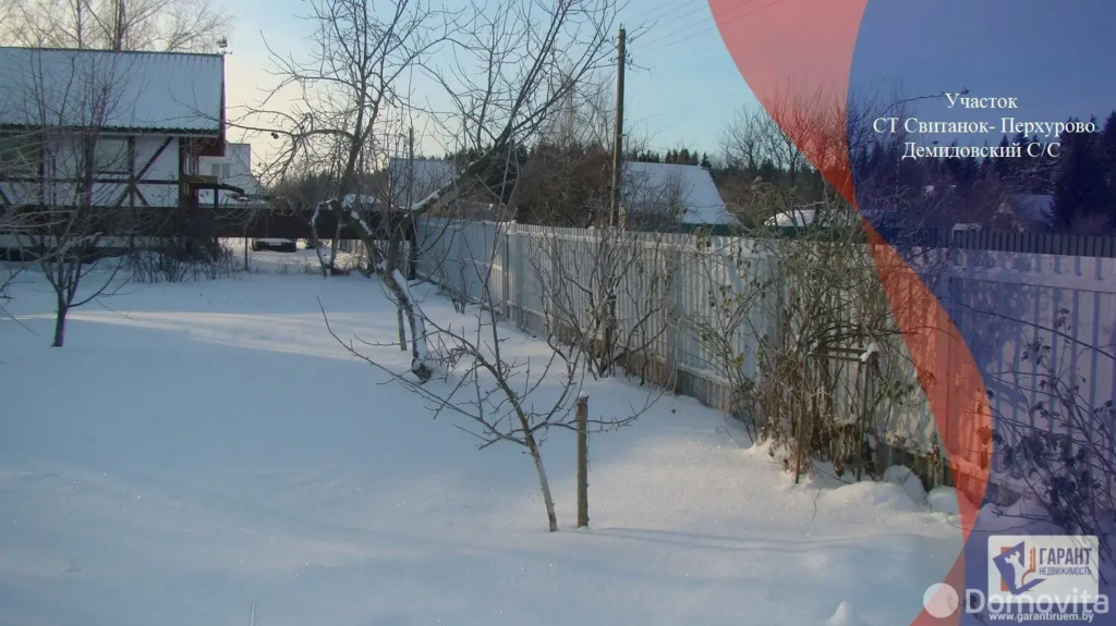 Еще одно садовое товарищество, на этот раз – в Демидовичском сельсовете, предлагает участок в 10 соток. Участок прямоугольной формы, ровный, огорожен забором. Имеется сарай, сад с плодовыми деревьями, теплица и огород.