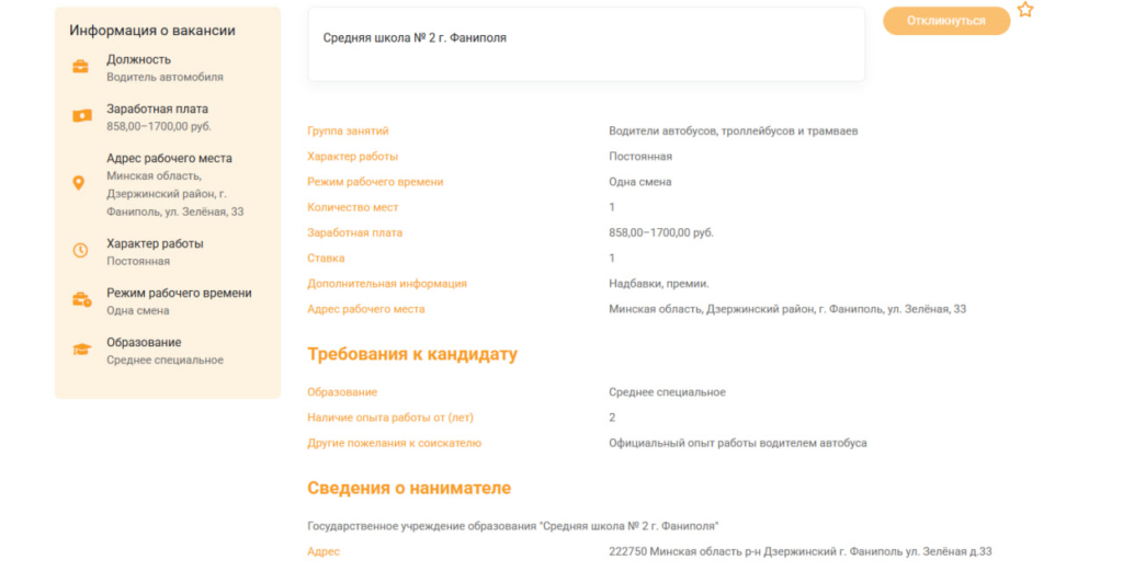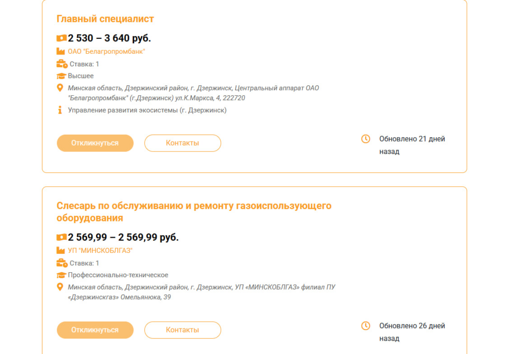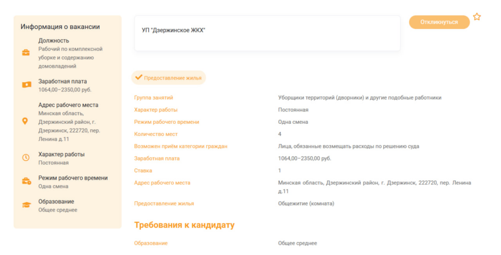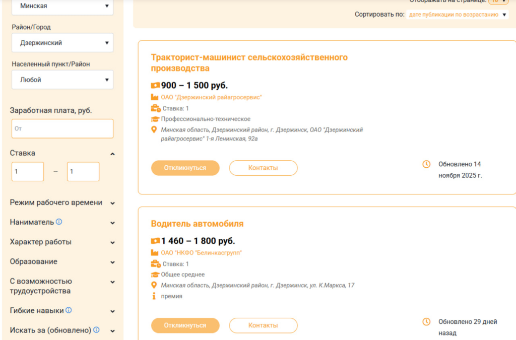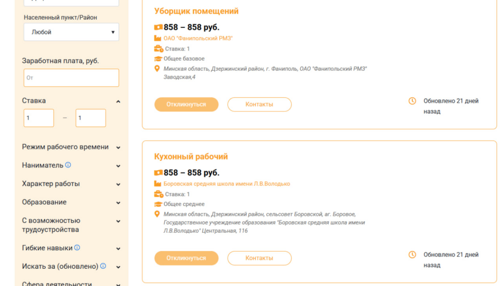 В ходе анализа мы изучили предложения на сайте государственной службы занятости (gsz.gov.by), рассматривая только вакансии с полной занятостью. Как выяснилось, минимальные предложения начинаются от базовой величины (858 рублей). Например, в эту категорию попадают позиции уборщика помещений на Фанипольском РМЗ, кухонного рабочего в школе агрогородка Боровое, вахтера и каменщика в «Гидромашсервисе», заточника на ДЭМЗе, а также младшей медицинской сестры по уходу в хосписе деревни Волковичи.