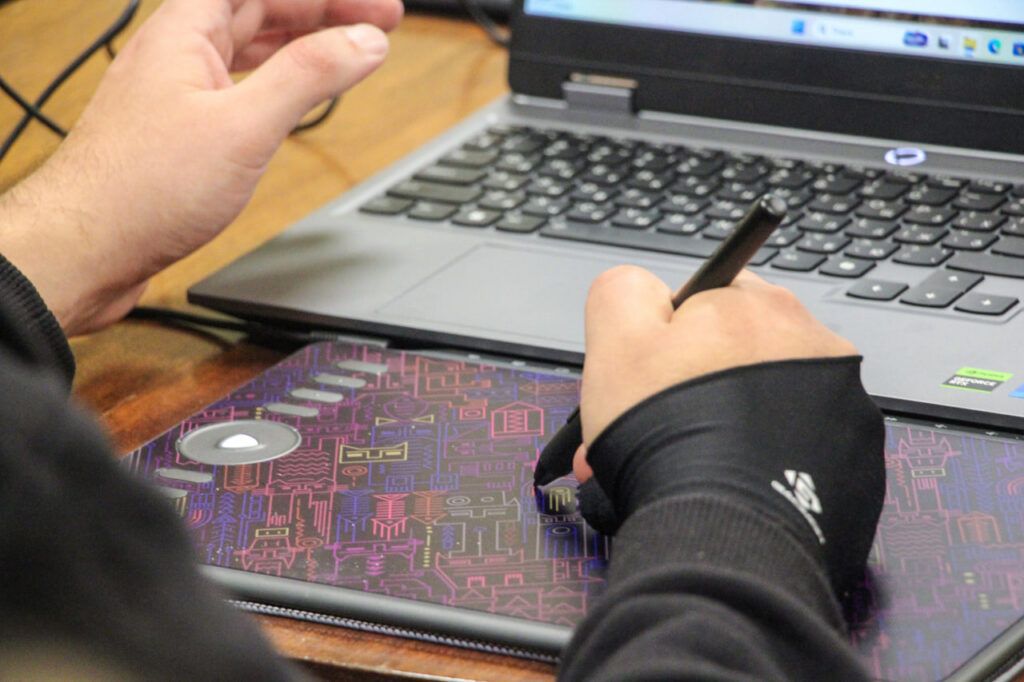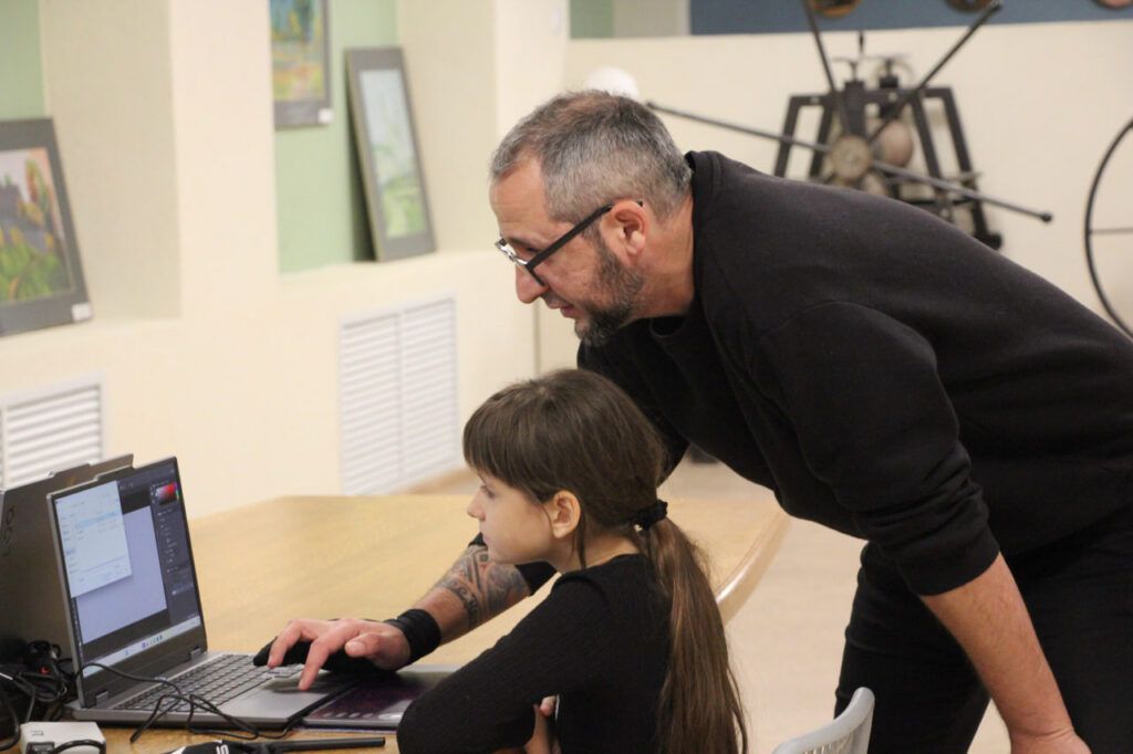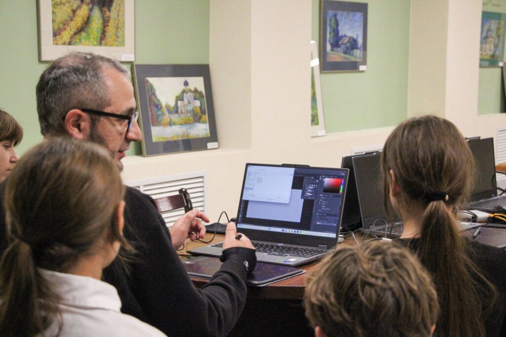 На столах – стройный ряд ноутбуков, рядом – графические планшеты и перья. Уверенной рукой учитель художественного отделения Владимир Хачатурян что-то отрисовывает и демонстрирует детям. Те столпились вокруг преподавателя и внимательно следят за каждым движением.