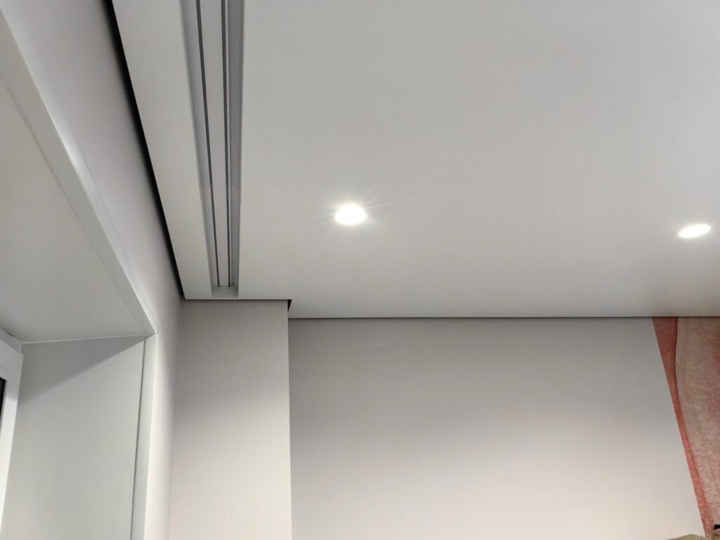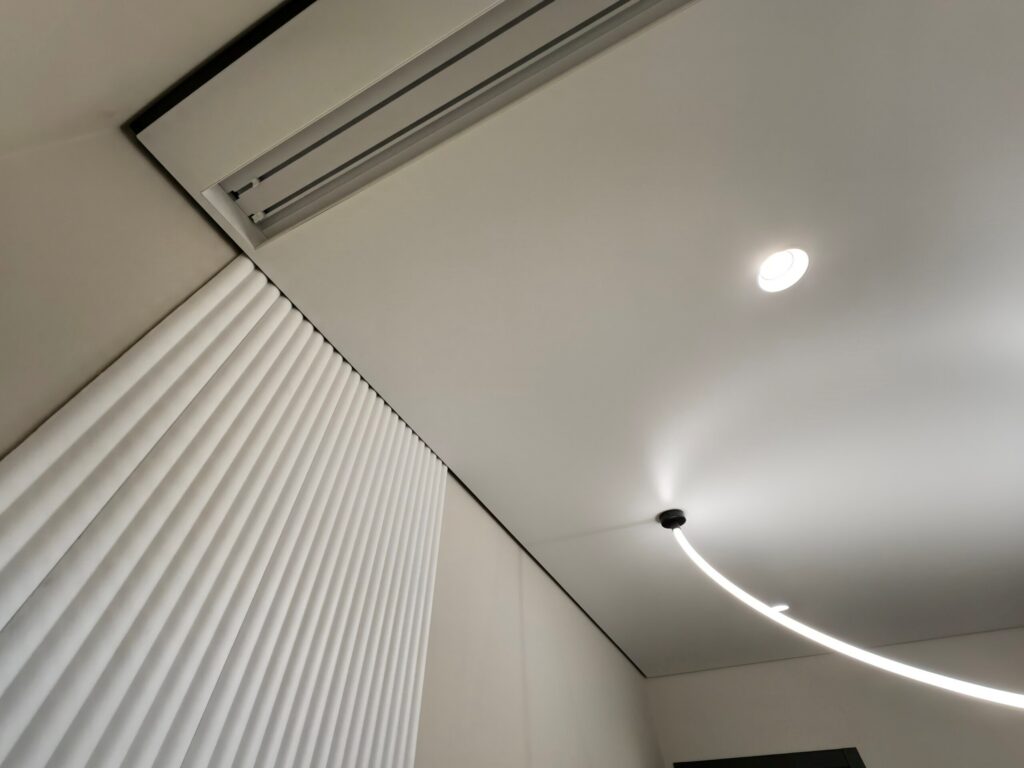 После монтажа главное, что бросается в глаза — ровный теневой зазор по периметру комнаты. Это не щель — это элемент дизайна, подчёркивающий точность сопряжения поверхностей. Он создаёт ощущение, что потолок не соприкасается со стенами, а буквально «парит» немного ниже основного уровня. Световая тень этого зазора меняется в зависимости от освещения и делает геометрию помещения выразительнее.