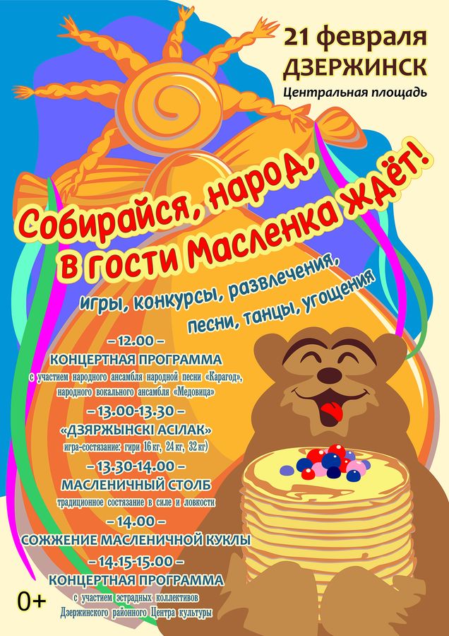 12.00 – 15.00 — Народное гуляние «Собирайся, народ, в гости Масленка ждёт!» (г. Дзержинск, Центральная площадь)