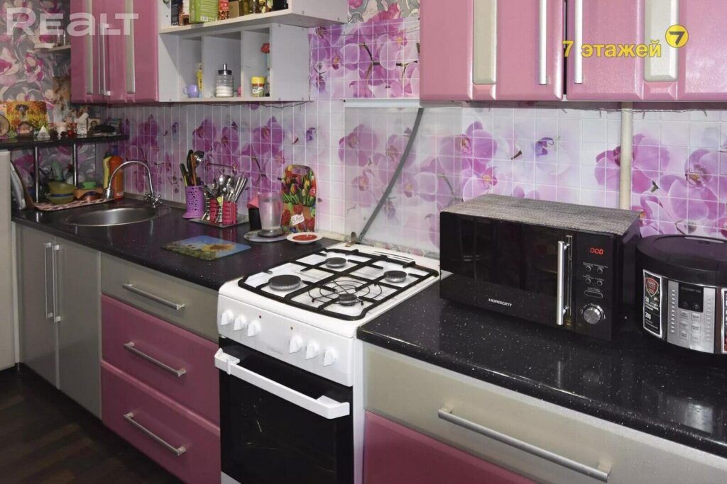 В поселке Энергетиков продается квартира для тех, кто, кажется, с детства бредил Барби. Кухня здесь – настоящий розовый оазис: этого цвета не только стены, но и вся техника, посуда и даже шторы.