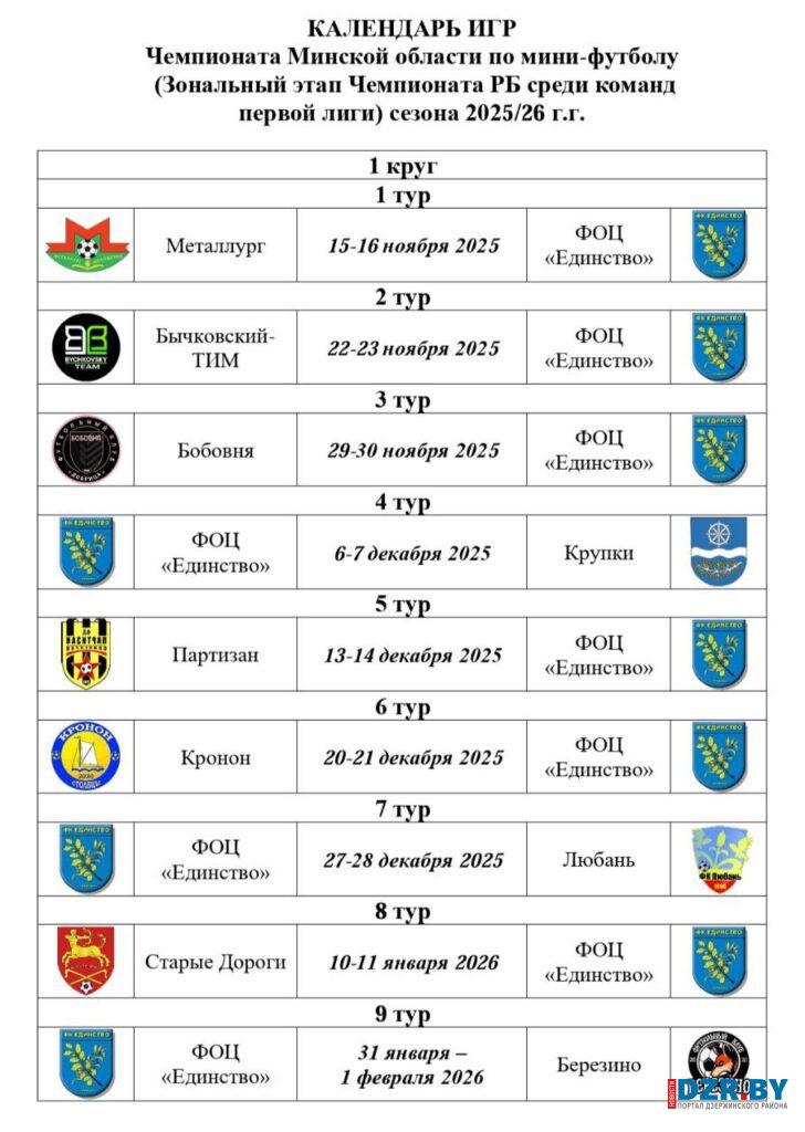 Уже в стартовом туре «Единству» предстоит встретиться с молодечненским «Металлургом» 15 ноября в 17:30 на площадке противника. Среди других соперников команды Дзержинского района — коллективы из «Крупок», «Бобовни», «Крононом» из Столбцов, «Бычковский-ТИМ» из Несвижа, «Старые Дороги», «Березино», «Партизаном» из Солигорска и «Любань».