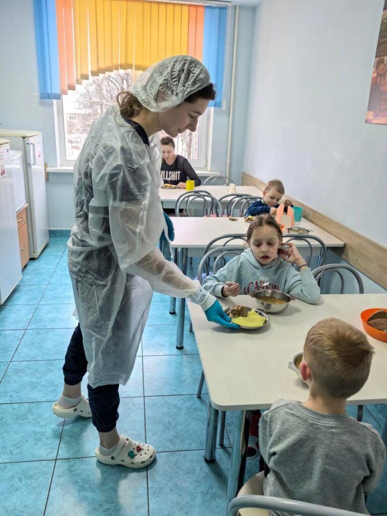 Хотя работа эта, конечно, далеко не про улыбки. На деле это непростой физический труд. Пищеблок находится далеко, и раздатчица везет тележку с едой по подвальным помещениям –+ «с горками, спусками и подъемами». А после стоит у раздаточного окошка, отмеряя порции и вручая людям.