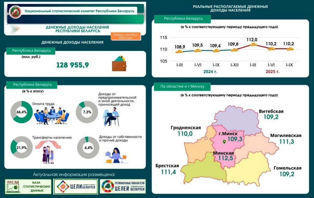 Реальные располагаемые денежные доходы населения Беларуси в январе — сентябре 2025 года составили 110,2% к уровню января — сентября 2024-го. Об этом сообщили в Национальном статистическом комитете.