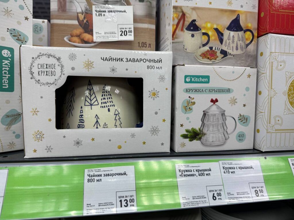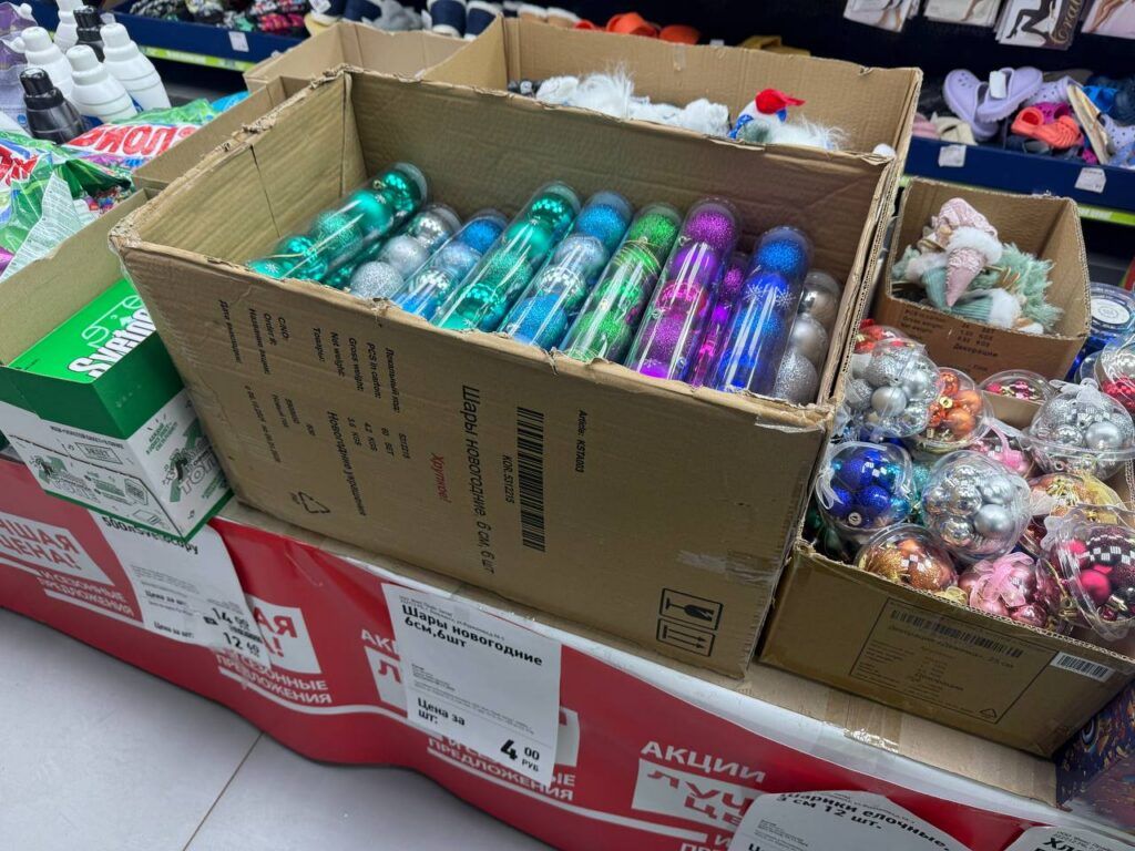 Ассортимент елочных игрушек в магазине тоже радует. Вас ждут стилизованные наборы по 4 штуки: например, «тросточки» за 5,90 руб. или «сапожки» за 7,90 руб. Широко представлена и классика: наборы шаров разных цветов и размеров по цене от 5,50 до 13,90 руб.