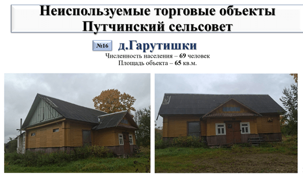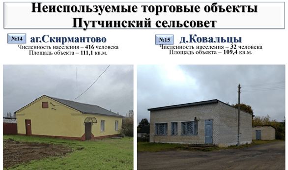 Путчинский сельсовет имеет три не вовлеченных в оборот торговых объекта в аг. Скирмантово, д. Ковальцы и д. Гарутишки.