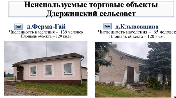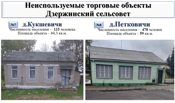 Дзержинский сельсовет имеет порядка четырех населенных пунктов с неработающими торговыми объектами. Речь идет о д. Ферма-Гай, Клыповщина, Кукшевичи, Петковичи.