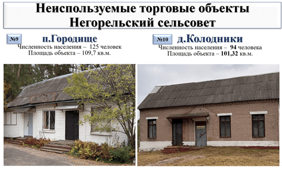 Неиспользуемые торговые объекты Негорельского сельсовета находятся в п. Городище и д. Колодники.