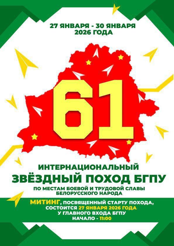 С целью гражданского и патриотического воспитания студенческой молодежи в период зимних каникул с 27 по 30 января 2026 года состоится интернациональный 61-й Звёздный поход БГПУ по местам боевой и трудовой славы белорусского народа. Девиз этого похода – «Молодёжь для Беларуси: помним, гордимся, созидаем!».