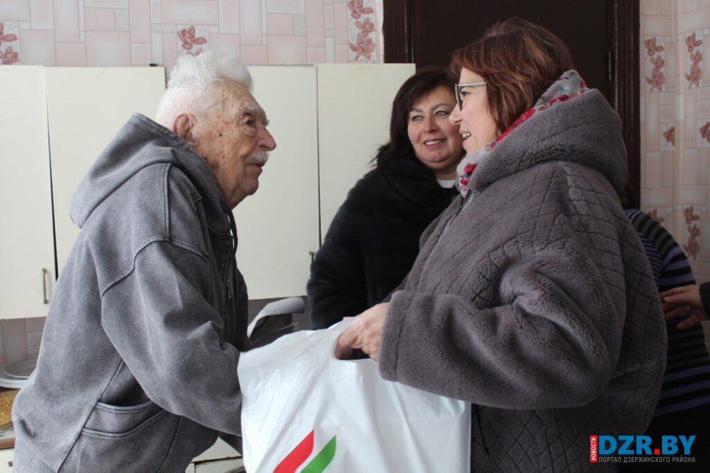 В гости к имениннику и его супруге Екатерине Яковлевне с подарками приехали заместитель председателя райисполкома Ольга Игнатова, председатель районного Совета ветеранов Виктор Феоктистов и руководство Дзержинского ТЦСОН, члены партии «Белая Русь» – Виктория Романович и Елена Вергейчик.