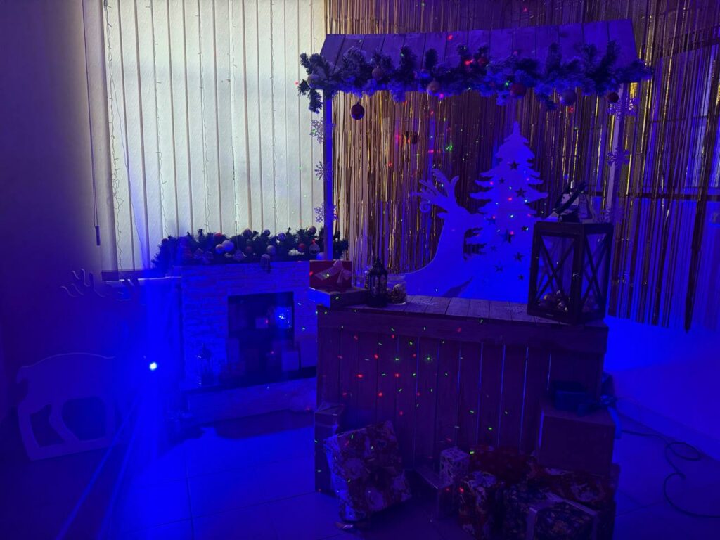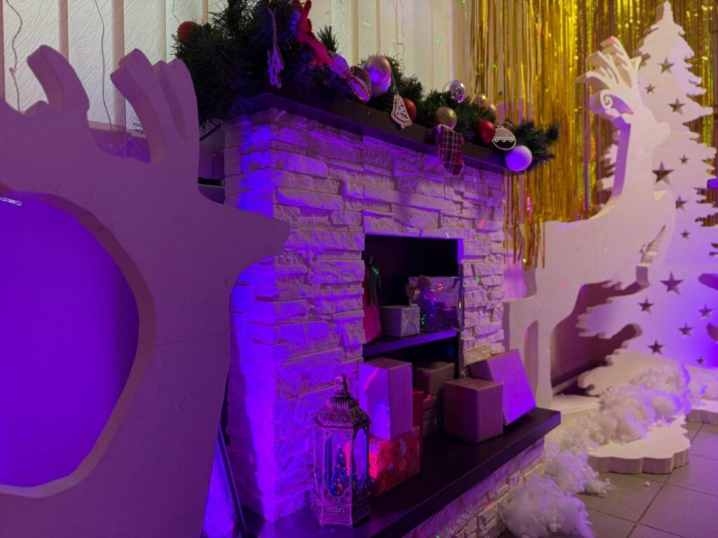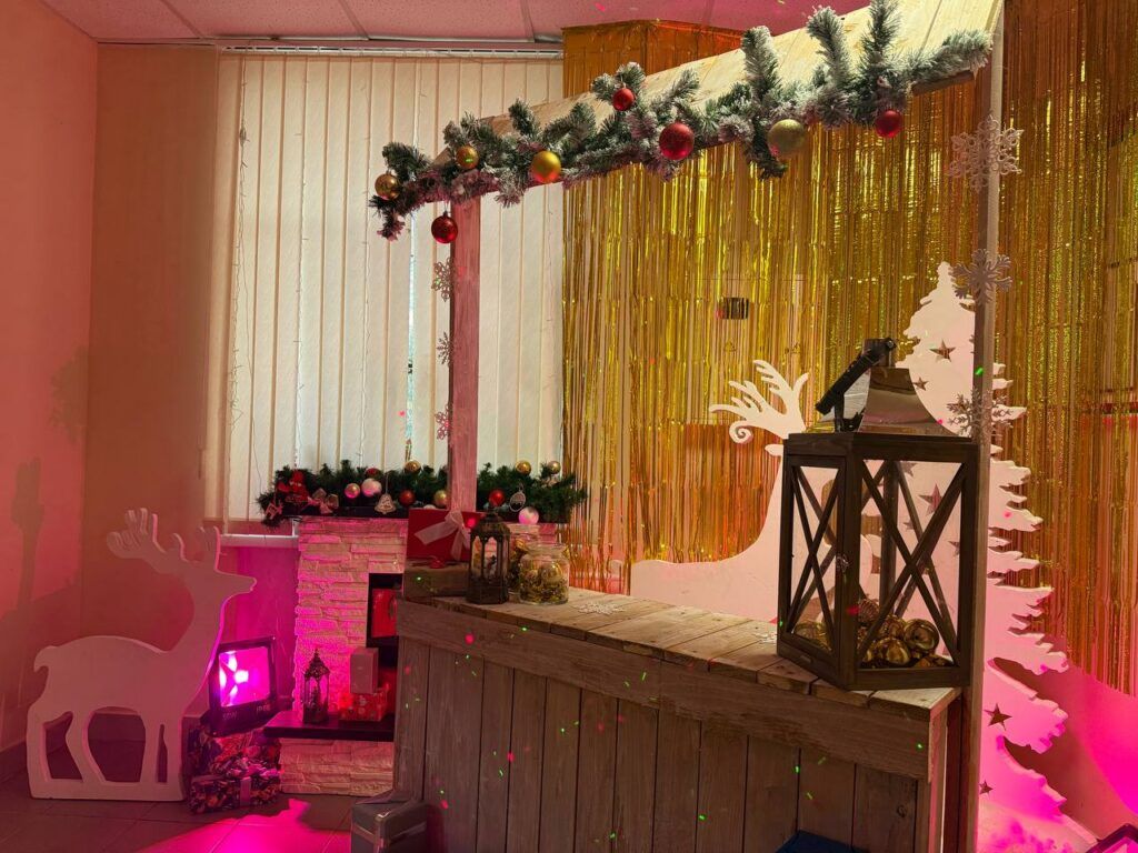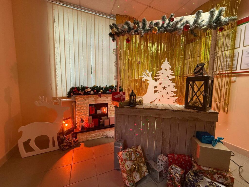 В холле сельисполкома расположилась масштабная новогодняя декорация. Здесь и прилавок рождественского рынка, и камин, озаряющий своим светом весь интерьер, и благородные олени, и подарки, ждущие своего часа и получателя.