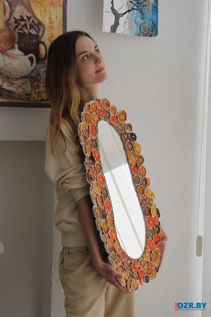И эти слова как нельзя лучше характеризуют ее подход. Так, среди экспонатов выставки есть зеркало, усыпанное… сушеными дольками лимонов и мандаринов. Некоторые из них даже подгорели в духовке, но это лишь добавило работе цвета и фактуры.