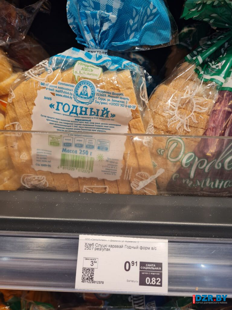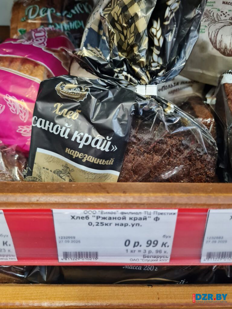 Так, на прилавке продуктовых магазинов нашего города мы нашли хлеб «Ржаной край» (250 г) за 99 коп., хлеб «Слуцкi каравай» (250 г) за 91 копейку и хлеб «Заводской» (400 г) – 95 коп.