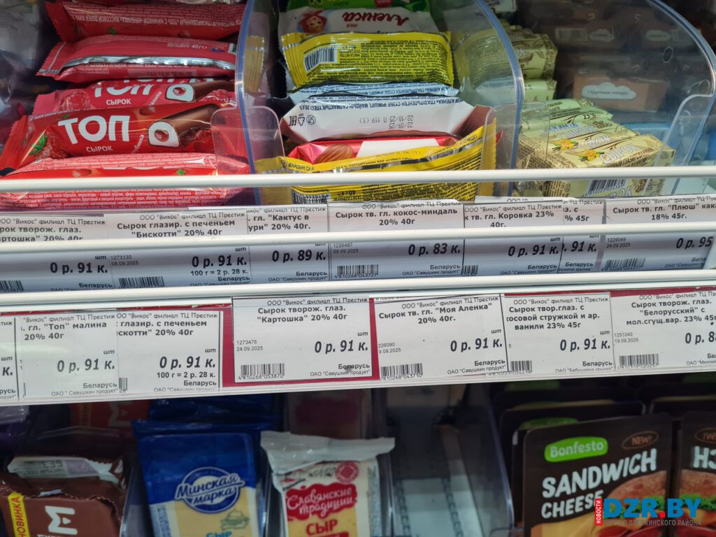 В большом ассортименте представлены творожные глазированные сырки (40 г). Их с ценником от 82 до 95 коп. можно найти в каждом магазине города.