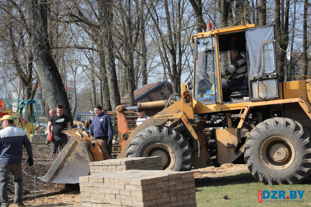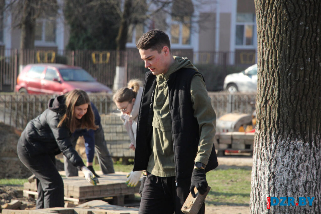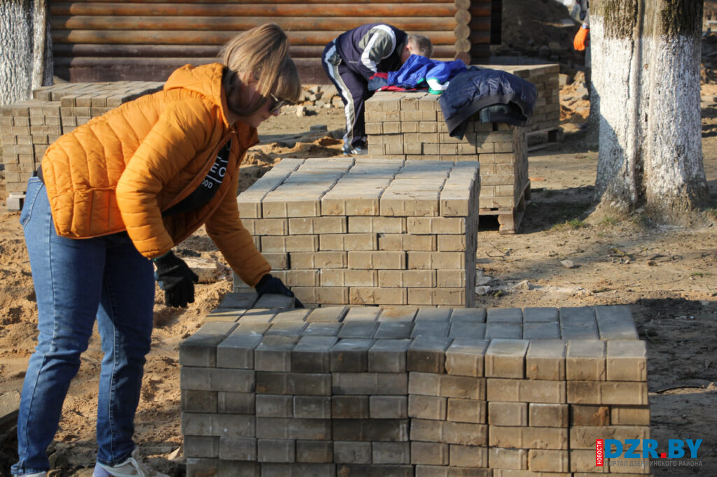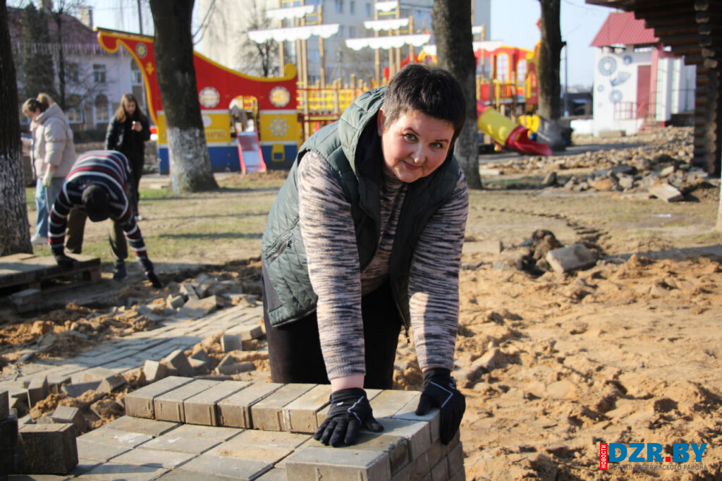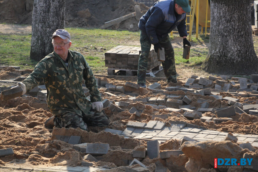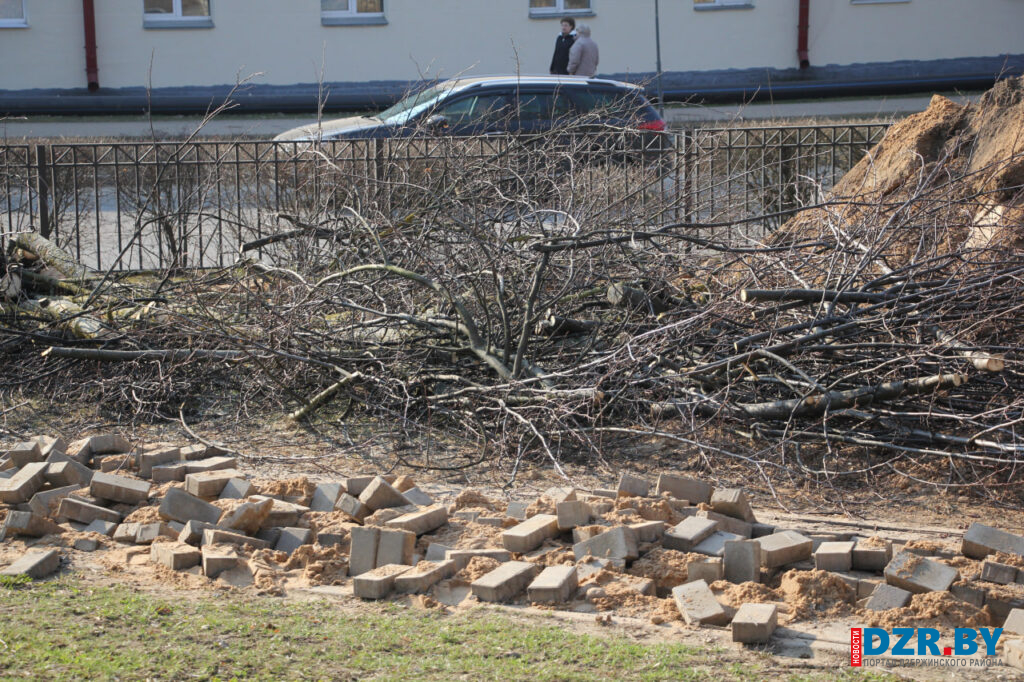 – Работы у нас здесь немало, – отмечает главный специалист отдела культуры Дзержинского райисполкома Светлана Иосько. – Наша задача – убрать старую плитку и очистить территорию от веток.