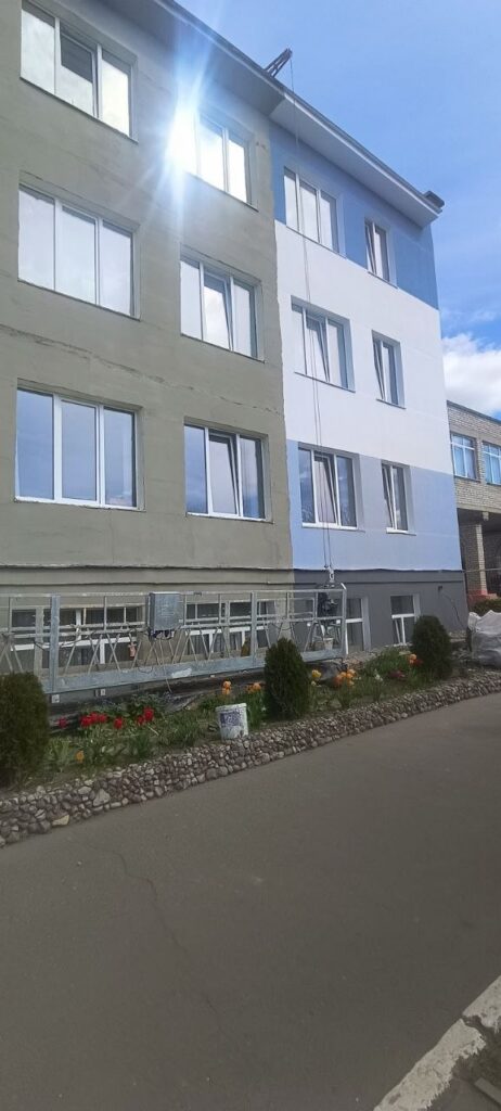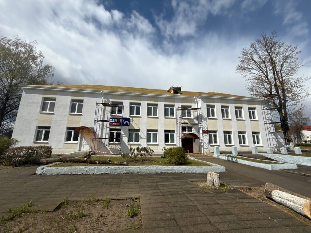 Центр творчества детей и молодежи после ремонта также будет полностью преображен. Фасад уже оштукатурен и покрашен. Сейчас рабочие переключились на кровлю.