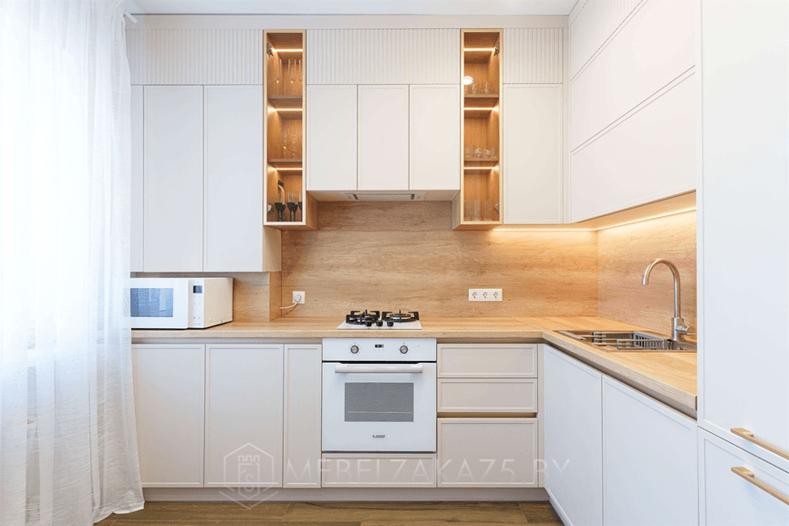 - Линейную LED-подсветку под навесными шкафами — для освещения поверхности готовки.