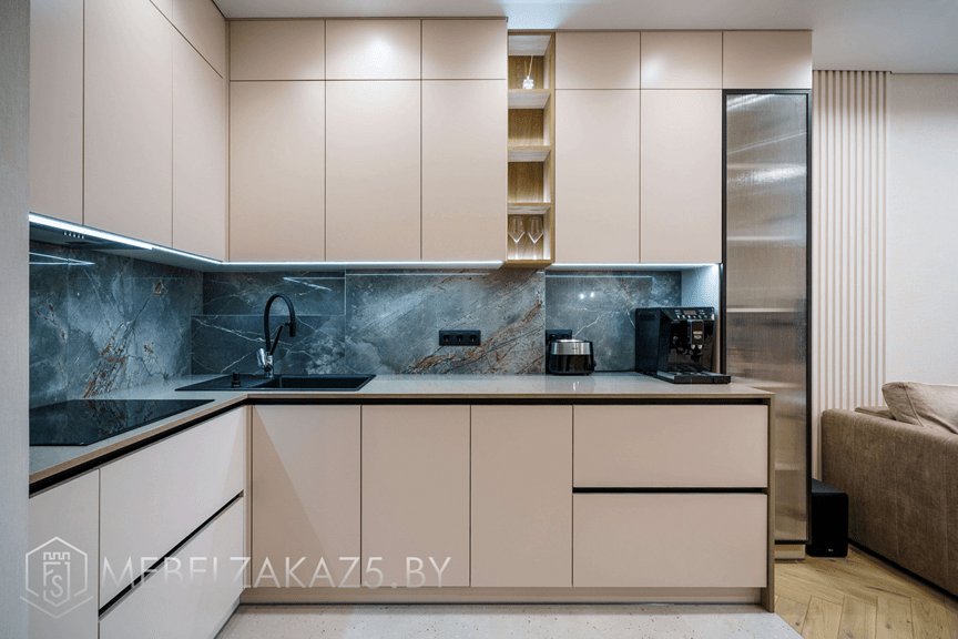 А вот холодильник часто остаётся отдельно стоящим — это дешевле, легче в обслуживании, и модельный ряд шире. Комбинированная схема (встроенная часть техники + отдельные крупные агрегаты) — самый частый выбор клиентов при заказе кухни в Минске.