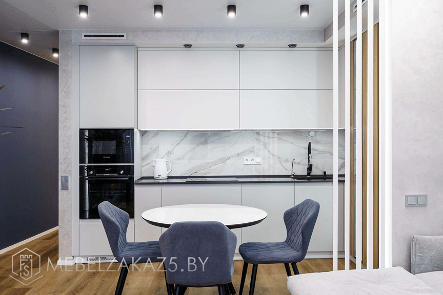 Однако в реальности квартир в Минске не всегда удается соблюсти идеальный треугольник. В студиях и кухнях менее 8 м² приходится отступать от классической схемы. Вместо треугольника — линейное расположение, где главную роль играет продуманное чередование зон. При проектировании кухни на заказ опытный дизайнер учитывает размеры, расположение окон и стояков, электропроводку, пожелания по бытовой технике и образ жизни клиента. Особенно при разработке малогабаритных гарнитуров важно не просто «вписать» технику, а сделать пространство удобным.