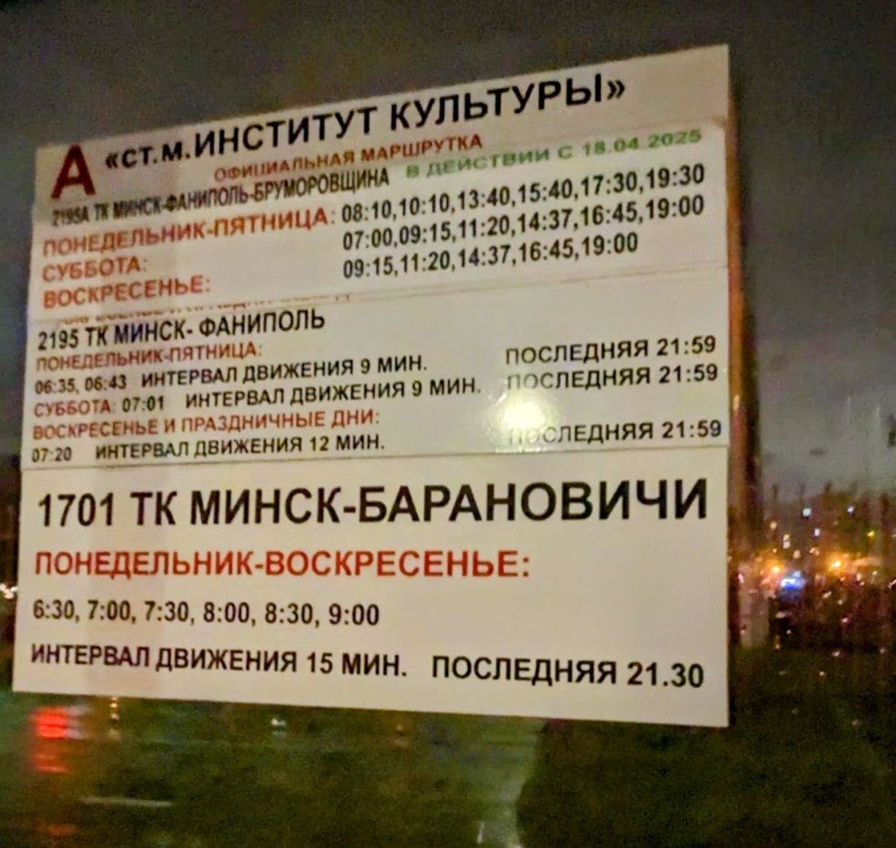 Вечер вторника, 28 октября. Остановка у «Институт культуры». На шильде расписание прежнее: последний рейс — в 21:59. Никаких упоминаний о новых, поздних маршрутках. До десяти вечера машины исправно приходят каждые 9-10 минут и, собрав салоны пассажиров, уезжают в Фаниполь.