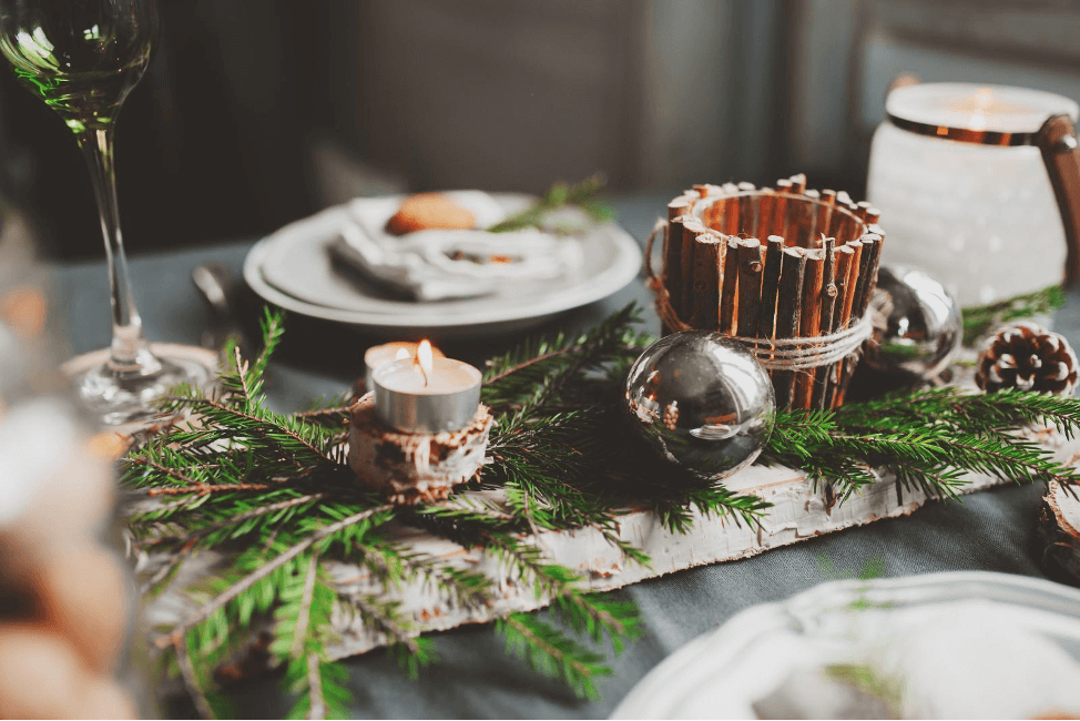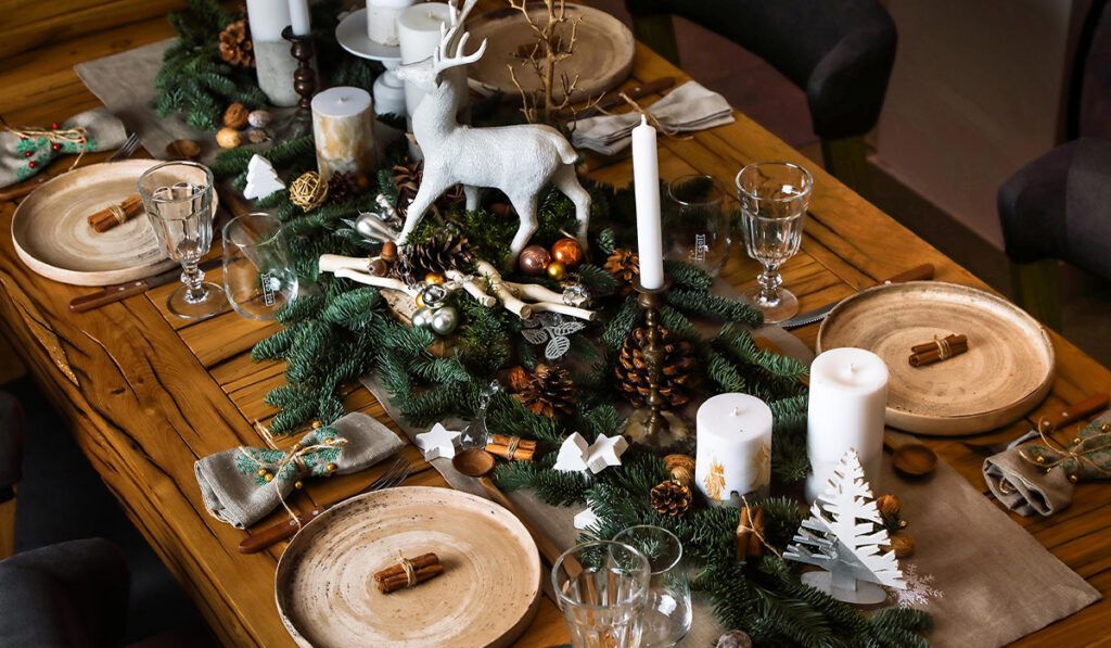 Любителям лаконичности и простоты подойдет скандинавский стиль. Светлые цвета (белый, бежевый, серый), одна композиция из хвои, много свечей, текстиль из льна или хлопка – идеальное решение для декора. Кстати, новогодние блюда можно подавать на деревянных досках.