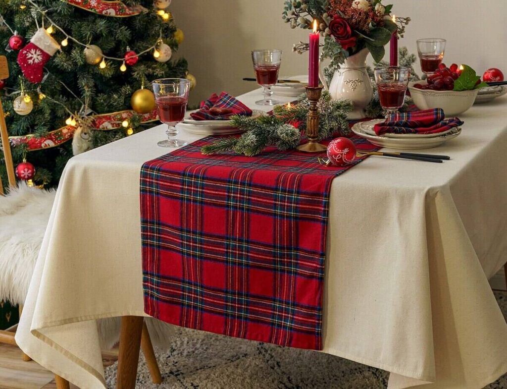 Для создания праздничной сервировки начните с выбора скатерти. Белый цвет – беспроигрышная классика: он, подобно холсту, оттенит любые яркие детали. Смелой заменой может стать глубокая красная или клетчатая скатерть в духе шотландки.